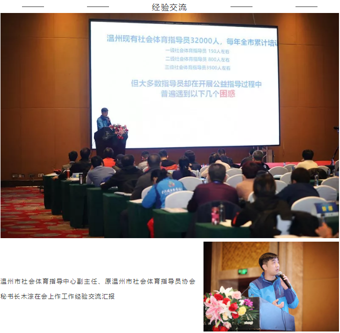 日前,2018年全国社体指导员协会工作会在重庆荣昌举行,会上,北京、上海、广东、宁夏代表省级社体指导员协会进行工作经验交流。温州作为唯一一个地市级社体指导员协会在会上作了主题为《以上岗履职为核心,打造科学健身指导服务铁军》的工作经验交流报告。