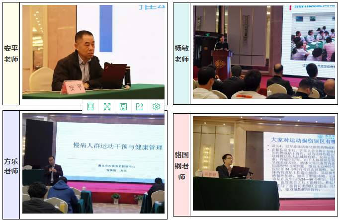 此次培训班由浙江体育科学研究所副研究员安平、浙江大学公共卫生学院营养与食品卫生学系副教授杨敏、浙江省疾控中心慢病研究所副主任医师方乐、温州市运动医学中心主治医师骆国钢、杜晓甫等专业导师主讲。分别就“体医融合”政策与背景解读、运动处方基础知识、运动与营养膳食、运动损伤预防与处置、慢病人群运动干预与健康管理等专业理论知识进行深入讲解。