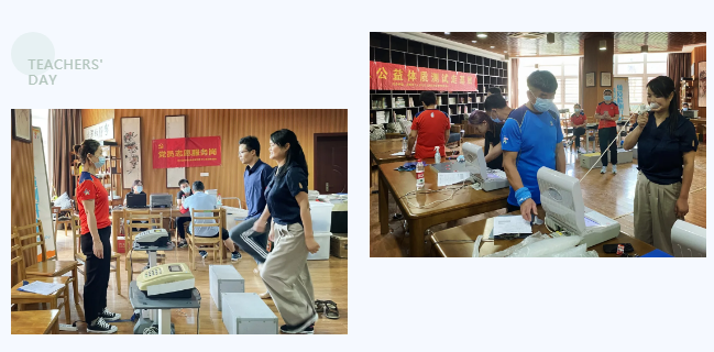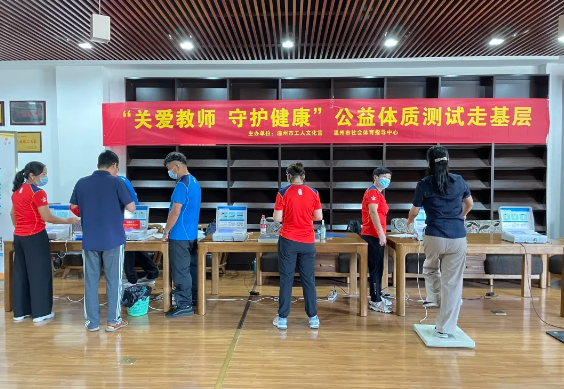 在教师节来临之际,温州市社会体育指导中心联合温州市工人文化宫组织开展“关爱教师·守护健康”公益体质测试走基层活动,这也是庆祝第37个教师节主题系列活动之一。9月9日,活动走进温州市瓯海第一高级中学,为该校教职工提供公益体质检测和科学健身指导服务。
