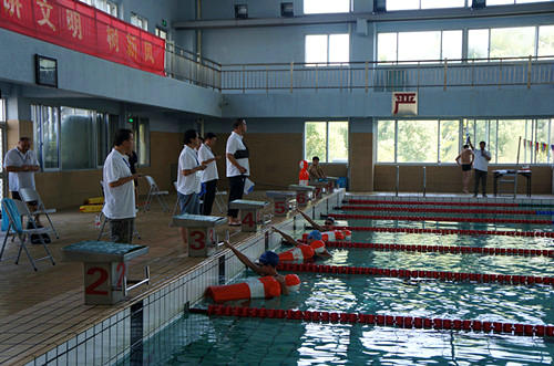 温州市第十五届运动会大众体育部水上救生比赛于2013年10月16日上午在九山游泳馆顺利举行。来自我市各县(市、区)共市7个代表团70余人参加。比赛分为男子组和女子组,设50米屏气潜泳、50米假人救生赛、100米浮标救生赛、200米自由泳障碍赛、4×25米运送假人接力和模拟救生赛共六个项目。最后,鹿城区代表团获得团体总成绩第一名,瑞安市代表团获得第二名,乐清市代表团获得第三名,龙湾区获得第四名,瓯海区、经济开发区、文成县依次获得第五、第六、第七名。