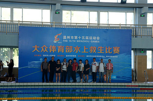 温州市第十五届运动会大众体育部水上救生比赛于2013年10月16日上午在九山游泳馆顺利举行。来自我市各县(市、区)共市7个代表团70余人参加。比赛分为男子组和女子组,设50米屏气潜泳、50米假人救生赛、100米浮标救生赛、200米自由泳障碍赛、4×25米运送假人接力和模拟救生赛共六个项目。最后,鹿城区代表团获得团体总成绩第一名,瑞安市代表团获得第二名,乐清市代表团获得第三名,龙湾区获得第四名,瓯海区、经济开发区、文成县依次获得第五、第六、第七名。