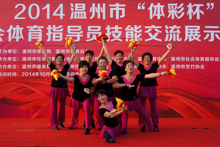 由市体育局、市体育总会主办,市社体中心、市体育彩票管理中心、体育中心、市社会体育指导员协会共同承办的2014温州市“体彩杯”社会体育指导员技能展示交流大会于10月12日下午在温州体育中心南广场顺利举行。来自我市健身舞协会、排舞协会、体育舞蹈协会、空竹协会等各体育社团近1000名社会体育指导员和健身爱好者们参加。